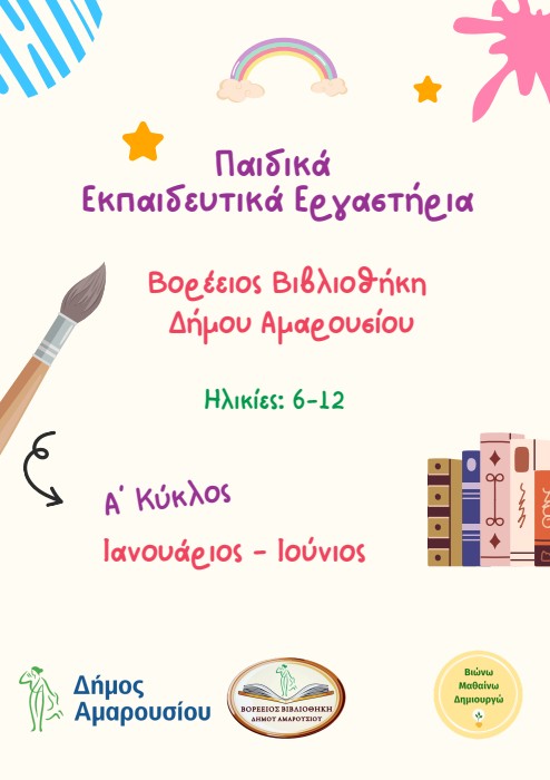 👧🧒 Εκπαιδευτικά εργαστήρια για παιδιά ηλικίας 6–12 ετών διοργανώνει η Βορέειος Βιβλιοθήκη του Δήμου Αμαρουσίου, με στόχο την ανάπτυξη της φιλαναγνωσίας 📖 στα παιδιά και τη γνωριμία τους με τη Βορέειο Βιβλιοθήκη.